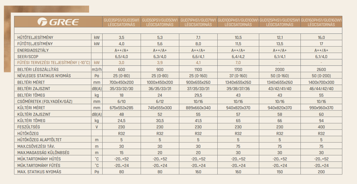 A Gree GUD35PS / GUD35W Légcsatornás Split Klíma fontos tulajdonságai: